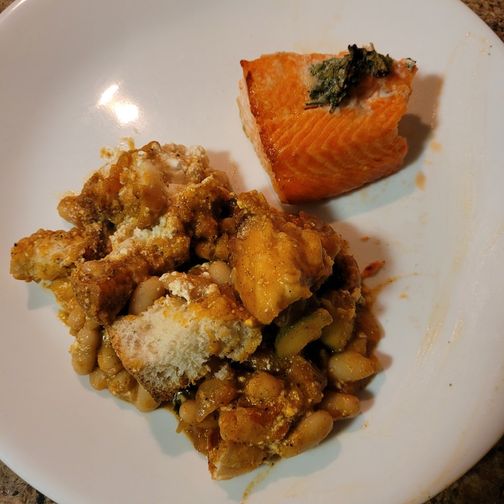 Baked salmon with fresh parsley, lemon juice and any spice I felt like went with the meal (I just used lemon pepper, salt, pepper, and garlic powder). I then sauteed zucchini, onion, tomatoes, some tomato sauce, a little chili powder, Italian seasoning and let the thing simmer. Then I used leftover bread to dice, toss in olive oil, and then baked for 5-10 mins on 450 degrees depending on desired “doneness”. Threw some white beans of my choice in with the zucchini, tomato stew, added the baked croutons, fresh parsley, and some ricotta to top the side off.